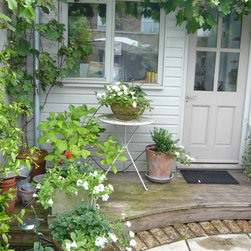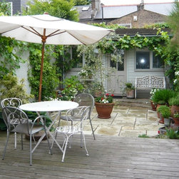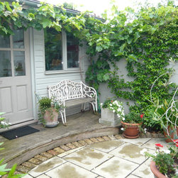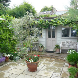 The Design Process: The decking was designed on the same level of the house where the glass french doors opens to the garden. A circular paved area were designed as a space to display a collection of pots which she brought from the old house. At the end another decking was designed as a platform to build the studio. All old brick walls were cladded with marine plywood and painted to match the green colour of the studio