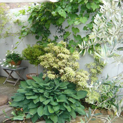 Major Soft landscape: Vitis vinifera, trachelospermum jasminoides, Hostas and seasonal plants for the pots