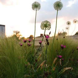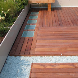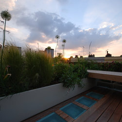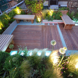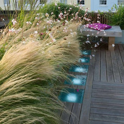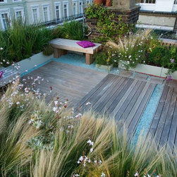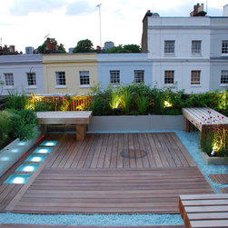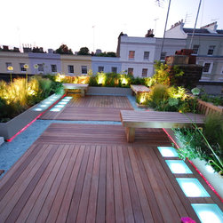 As with all roof terraces on older buildings, there are limitations to the weight and loadings one can put on the roofing timbers. Therefore all materials and planting have to be designed to minimise the stress on the roof structure. Charlotte Rowe Garden Design’s solution was timber decking, Western Red Cedar benches, large enough to be used as day beds and sun loungers and caramel coloured steel planters. There are frosted glass panels set into the decking which are under-lit at night creating a magical effect.