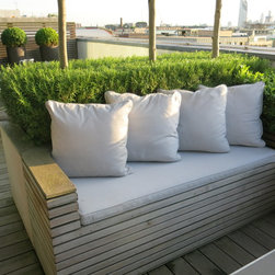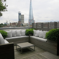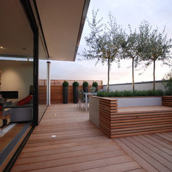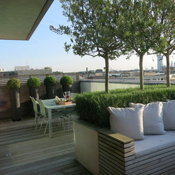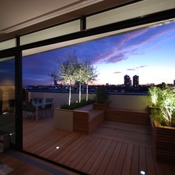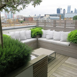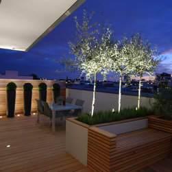 This rooftop garden was created around a newly built atrium-style sitting room built on top of a former warehouse in Bermondsey. The style of the interiors was contemporary so the terrace needed to reflect this as it was integral with the indoor sitting area. To one side of the sitting room is a 9m x 3.5 metre terrace facing West with views over London which is accessed via sliding glass doors. Charlotte Rowe Garden Design broke this terrace up into two distinct zones to maximise the space available and created a dining terrace on one side and a built-in sitting area with storage on the other. Clear stemmed olive trees under-planted with rosemary divide the two spaces and trellis is used to provide some shelter from the wind, increase privacy and at the same time allow views over London. The decking and seating are made of Western Red Cedar, tall stoneware pots along one side provide added interest and the space is lit dramatically to create a wonderful outside room.