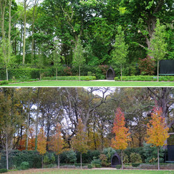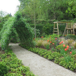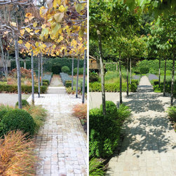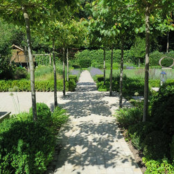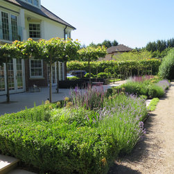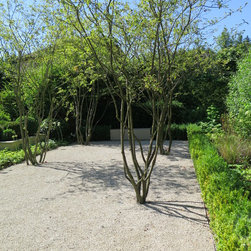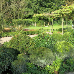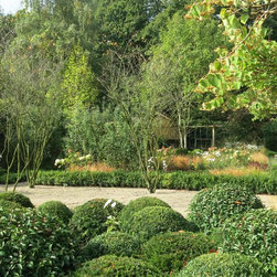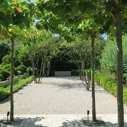 In addition to the new limes, a number of other new trees were planted including a row of Pyrus calleryana 'Chanticleer', a Persian Ironwood and some lovely clear-stem Magnolias. The planting includes cloud planting of Buxus and Taxus interspersed with ground cover and grasses in the raised beds between the parking area and garden itself. There is a lavender fringed path and large beds of mixed shrub, perennial and grass planting.
