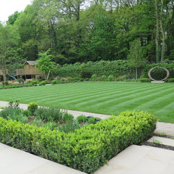 The brief was to create a striking garden with a large paved terrace close to the house and a large lawn and a good-sized children's play area. The client had a double garage and annexe with a very large parking area in front which also needed to be redesigned. The garden needed to look good from a number of angles as the house sits well within the site. It was also agreed that a sculpture should be the focal point of the main lawn.