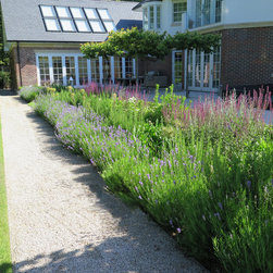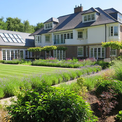 We were commissioned to design and create a garden for one of our former clients who were moving into a much larger house in a fashionable residential suburb of London. The classic modern house, which had been built a few years before, had not been lived in for some time. It needed a large amount of work including building a whole new wing to house the family kitchen and living rooms. The 3000 square metre garden was rather stark and empty with some rather sad-looking cypress trees and an enormous water feature, not really ideal for a growing family. The property is surrounded by the large very mature trees and informal grassed areas which form part of a common so the borrowed landscape is important. Most of the trees are many centuries old and, although beautiful, cast a great deal of shade over the boundaries of the property. The other issue was that that there are some large ponds close to the boundary and as the garden was created, it became clear that the water level was extremely high making it very difficult to plant.