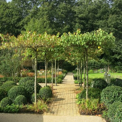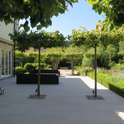 We decided to pave the main terrace in a pale buff sandstone with a large generous bed dividing it from the lawn and the rest of the garden. Across the main terrace there are two rows of umbrella-topped lime trees planted into the paving and these lime trees are continued across the path which divides the terrace from the modern parterre which separates the garden from the parking area to the front of the house, creating something of a theme throughout the garden.