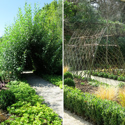 The terrace is where the main dining area is located and there is also a built-in BBQ. From the modern parterre which is planted with beautiful cone-shaped multi-stemmed Amelanchier lamarckii, there is a living willow tunnel leading to the children's play area which has a lovely raised playhouse.