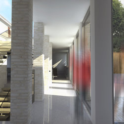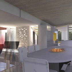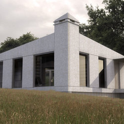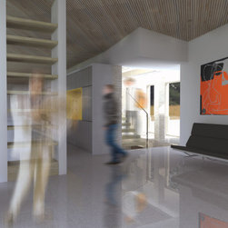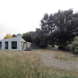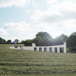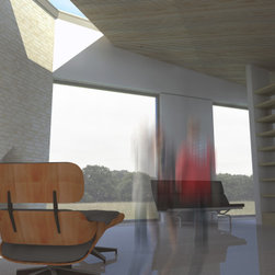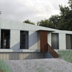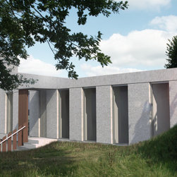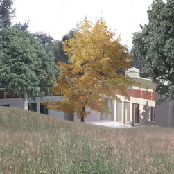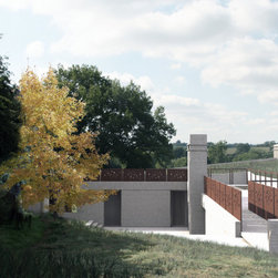 This stunning example is a part earth sheltered structure. It has two levels plus a roof terrace. The sloping site allows each level to connect to the ground level. The L-shaped plan is arranged to provide views to the surrounding landscape and to scoop in the daylight into the interior space.