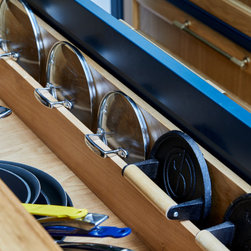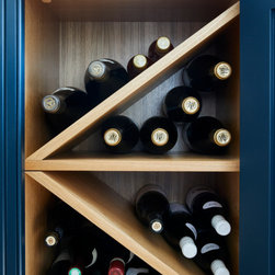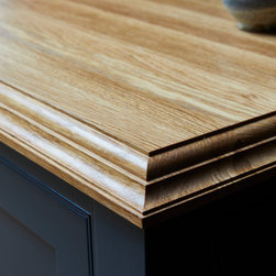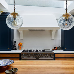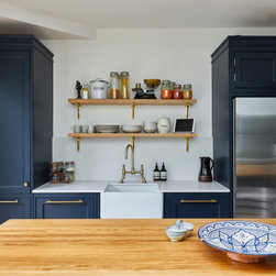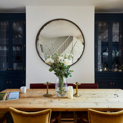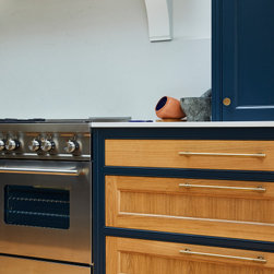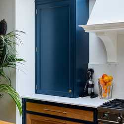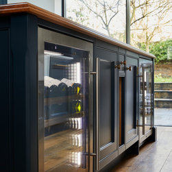 This basement kitchen was a joy to design partly because the clients are such a lovely couple to work for- She is the director of a few restaurants in the city and he a healthy wine afficionado so both had very clear ideas about what they wanted in the space. One of the first things on the list was the spice cupboard, the second, wine storage! Quite early on we decided the island should be kept clear for prep so a galley style kitchen with a large prep island was the starting point. An opulently sized range cooker with large drawers either side for pots and pans took centre stage on the left hand wall under the natural light of the skylight. I suggested a canopy with corbels to house the extractor. The corbels mean you don't need the 'legs' of the mantle which in this case would take up much needed worktop space. This becomes the focal point on that wall. The dressers either side mean the worktops can be kept virtually clear. The left hand one being the spice cupboard and the right hand one having adjustable shelves with space below for worktop appliances. The opposite wall contains the butler sink, American fridge freezer and a pantry. The open shelves above the sink again add a focal point on that wall but also give easy access to regularly used items. The island with its beautiful solid oak Spekva worktop with venetian edge detail is perfect for prepping on and the oak adds a warmth to the room that quartz just would not. The island also holds an abundance of storage - including 2 wine fridges and a wine rack, pan drawers and extra large cupboards (for those annoyingly large items like vases and serving dishes!) Every detail was thought through. Skirting either end of the island adds an air of tradition to the piece while the central working areas that you stand at to prep food are left as the more practical plinth giving space for your toes. Little details like a rail inside the pot drawers to hold lids just make the drawers that more practical with ease of use as a priority.