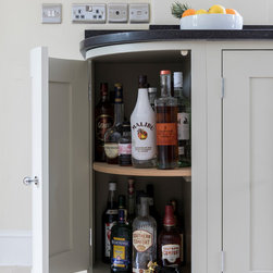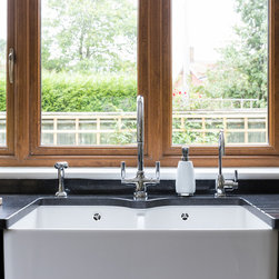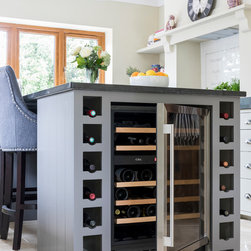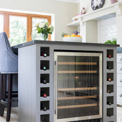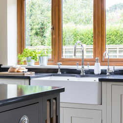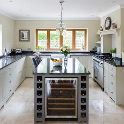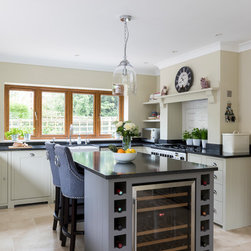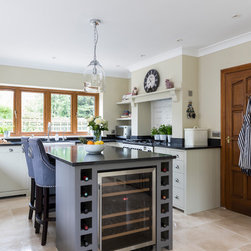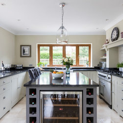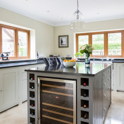 Neptune handmade Suffolk Shaker style kitchen wall runs in handpainted Dove Grey island in Mist with wine cooler. Quartz Unistone worktop fitted by is this stone. Perrin and Rowe tap and boiling water tap, villory Boch 800 belfast sink.
