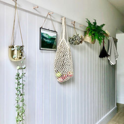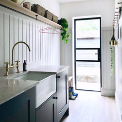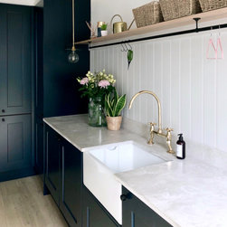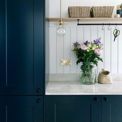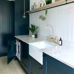 This narrow space in a newly built side extension was turned into a pretty utility space, packed with storage and functionality to keep clutter and mess out of the kitchen.