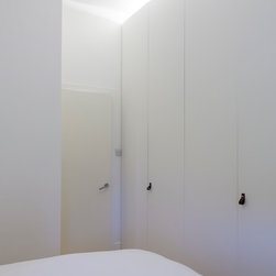Bespoke full height wardrobes provide for plenty of storage space for the entire apartment. LED strip lights are hidden behind the top of the doors. Leather hooks are used as door handles