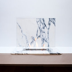 Two slabs of Arabescato marble are set into a plaster shelf and into the wall to form the surround of a contemporary fireplace