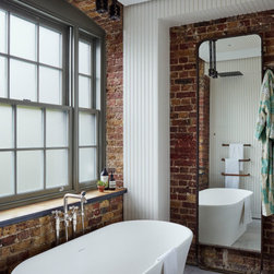 The original brickwork set against the white wall panelling in this bathroom creates a pleasing contrast between old and new.