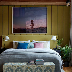 The purple and pink tones of the artwork in this bedroom set against the green wall panelling creates a dramatic space full of contrast and fun. The bold colours are tempered somewhat with neutral tones in the throw and ottoman, inserting elements of calm and neutrality into this eclectic space.