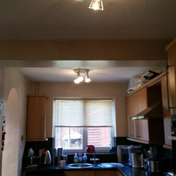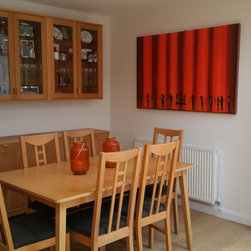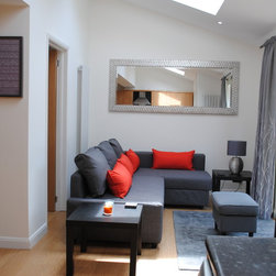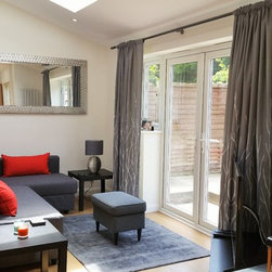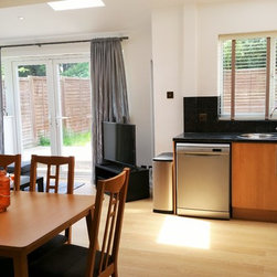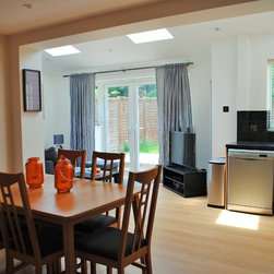 With this project, the clients had a limited budget and wanted to knock down the existing conservatory and add a single story rear extension. They wanted more space for family entertaining and relaxation as well as storage solutions. Sai Interiors put forward a design proposal to convert the existing garage to a habitable space which was divided into two room, a utility room and a room filled with storage solutions to ease the lack of storage in the house. We then proposed creating an open plan kitchen, dining and living room. The client wanted to keep the existing kitchen but we moved the sideboard and wall unit in the dining area to create a better aesthetic. We also added three large veluxes in the living and kitchen area to create a brighter space. The clients were delighted with the result.