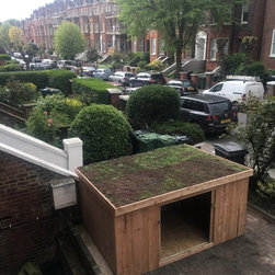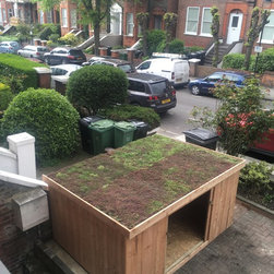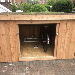 A 6-bike Slot-in bike shed, just in this case it has sliding doors. Clad in Scottish larch and with a living sedum roof.