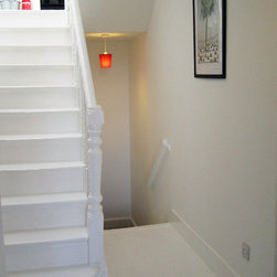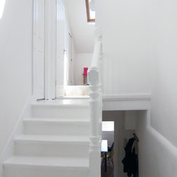 The white painted timber floor and stair help create a clean space acting like a gallery / exhibition space for the occupants. The use of skylights introduces natural light into the interior of the house, which bounces on the white walls.