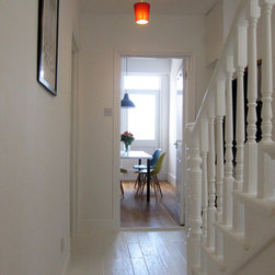 I was looking for a clean Scandinavian look. The white painted timber floor and stair help create a clean space acting like a gallery / exhibition space for the occupants. An interesting feature was the use of upside down red lamps on the ceiling which makes the space feel more abstract.