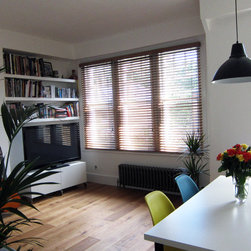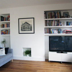 In this project I was looking for a clean Scandinavian look. The bespoke shelving becomes a library wall which becomes the main feature of the room adding colour and texture, also creating a place for the TV and making it part of the room.