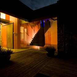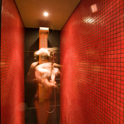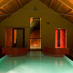 Natural riven slate, warm red and orange tones, and tiles are used extensively throughout the interior, for flooring, wall finishes, and feature spaces. A deck level surface is used to maximise maximum water depth, saving on excavation depth, and improving water quality. This seamless waterline, with the pool hall surround transforms the interior space into a luxurious feel.