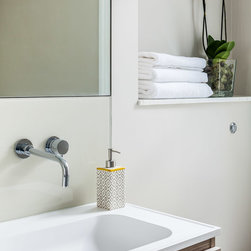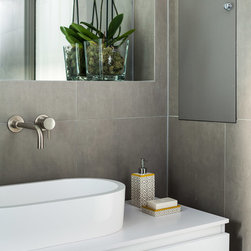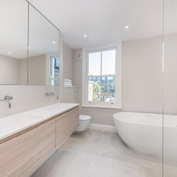 The bathrooms are complete with porcelain tiles and veneer look laminate bespoke designed vanity units. Integrated and concealed storage is utilised throughout all bathrooms.