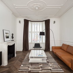 The material palette for this house is subtle and refined. Grey stained oak flooring in the drawing room is also used throughout the main staircase which is fully bespoke.