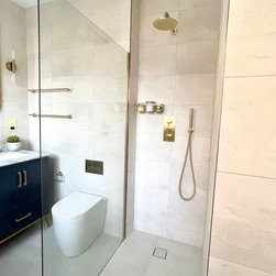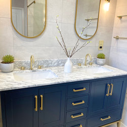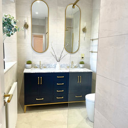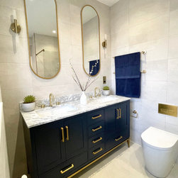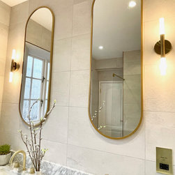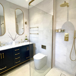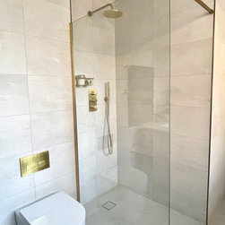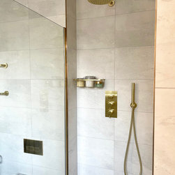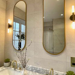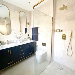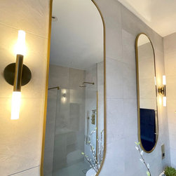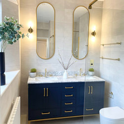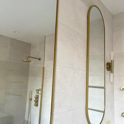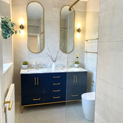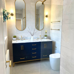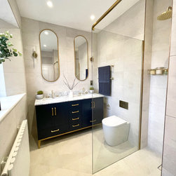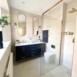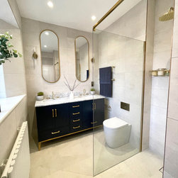 The renovation of this bathroom was part of the complete refurbishment of a beautiful apartment in St Albans. The clients enlisted our Project Management services for the interior design and implementation of this renovation. The brief was to create a beautiful "hotel feel" space which had a huge wow factor. We wanted to create a focal point upon entering the room. We did so with this beautiful vanity unit and added gorgeous wall lighting and a pair of stunning pill mirrors to complete the look. Accents of brass were added and a walk in shower. We loved the results and more importantly so did the client.