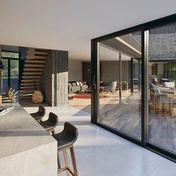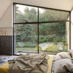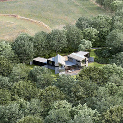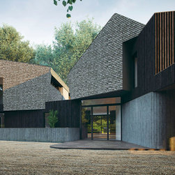 Internal & external spaces are organised by the low walls that conceal and protect as well as revealing and framing views. Atop the low walls nestle shingle hideouts which are punctured to provide secluded views to the woodland canopy.