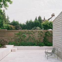 The back extension is clad with three-dimensional textured timber boards to produce heavy shades and augment its sculptural properties, creating a stronger relationship with the mature trees at the end of the back garden.
