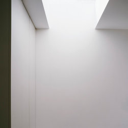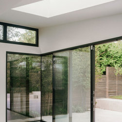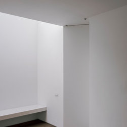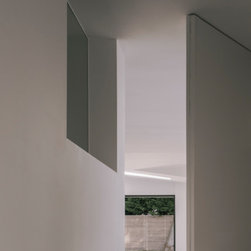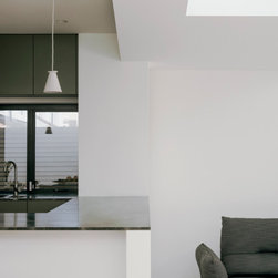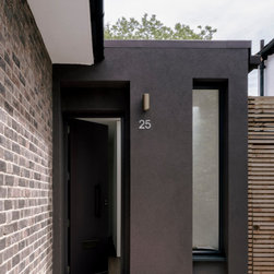 The side extension is monolithic, with hollowed-out apertures and finished in dark painted render to harmonise with the somber bricks and accommodates ancillary functions.