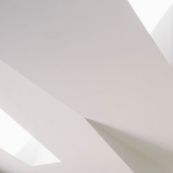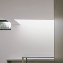 An architectural nacre piece is hung indoors to "catch the light" from nearby sources. A precise study of the sun path has inspired the careful insertion of openings of different types and shapes to direct one's view towards the outside.