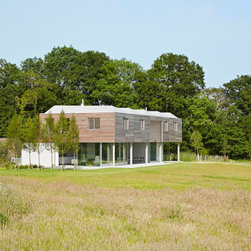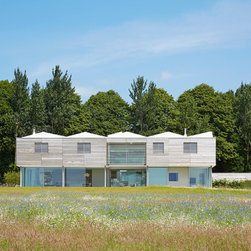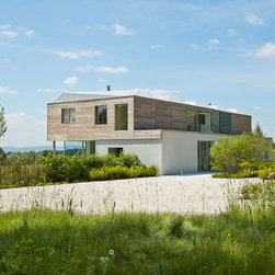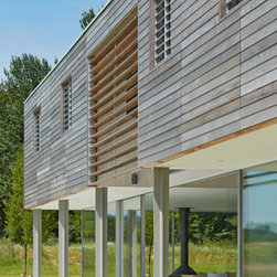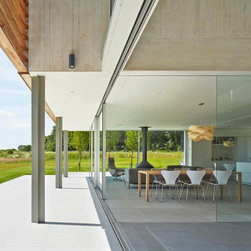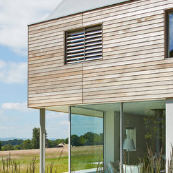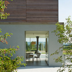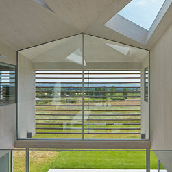 The external cladding of western red cedar ages to match the colour of the winter trees and dry grasses. Sliding shutters, hidden when not in use, cut out solar glare in the summer months. The south facing glazing is protected from high sunlight but allows solar gain from the low winter sun. The house is naturally ventilated with heating and hot water from an efficient biomass boiler.