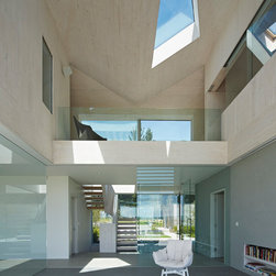 The master bedroom suite on the ground floor has its own snug with a fire place and secluded external terrace. There are three more bedrooms on the first floor, and a study overlooking the double height space. Here the construction, including the walls, is entirely of cross laminated timber.