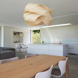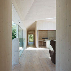 The roof is made from a series of tilted triangular planes forming a folded, undulating surface inspired by the shape of the surrounding hills. This creates sculptured interior spaces with the natural timber surfaces giving a warm and tactile quality to the rooms.