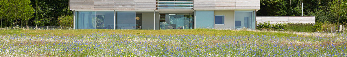 It sits between a protected formal garden at the front, and a wild flower meadow to the South. The social spaces on the ground floor are open plan and give wide views across the landscape. A double height ‘winter garden’ unites the ground and first floors creating a dynamic central double height space with views in all directions.