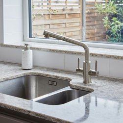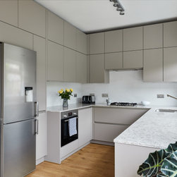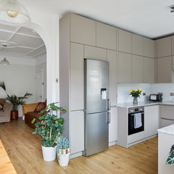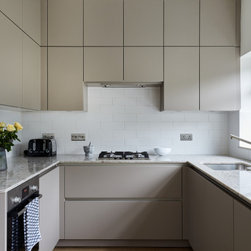 A simple contemporary kitchen that maximises storage by making use of the high ceilings. Warm grey handleless cabinetry is combined with a pale quartz worktop with hints of grey, beige and brown. The splash back of white ceramic tiles keeps the room looking sharp and bright.