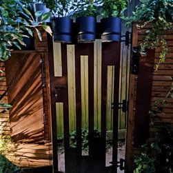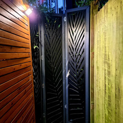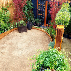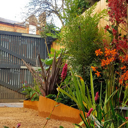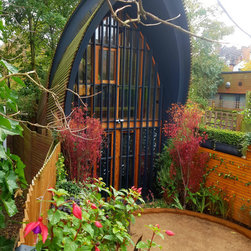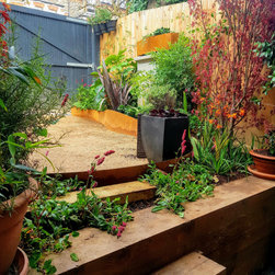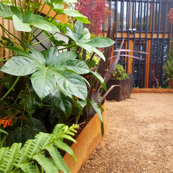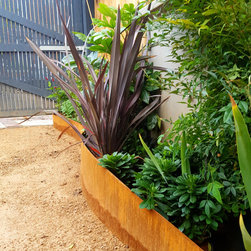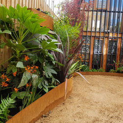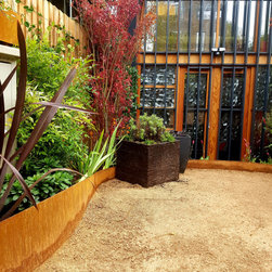 The brief was to create a garden in a garage so can be used for both.This was a quite challenging project using cor ten steel as raised beds in a abstract organic design. The flowing lines breaks the horizontal ones of the amazing architecture.