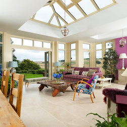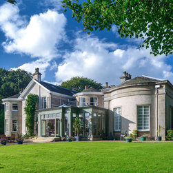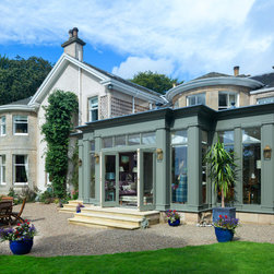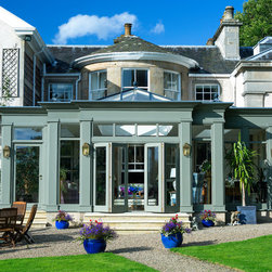 The orangery's stepped floor plan perfectly accompanies the existing footprint of the building and the timber pilaster posts and heavy mouldings reflect the original stonework and ornate features of the exquisite property. Complementing the already spacious interior, a set of bi-folding doors to the front can be thrown wide open to make the most of the summer sun, and close out the weather in the colder months, without compromising the view . Fanlights above give added height to maintain the grandeur and sleek lines throughout. A delicate balance between the old and the new is maintained by a subtle moss green microporous stain. Together with slate and mature copper, it gives the exterior a classic feel, whilst inside retaining a modern and comfortable design.