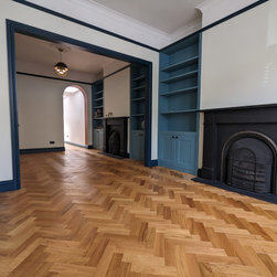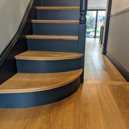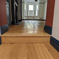 We skillfully crafted a traditional oak staircase in a large Victorian terrace in East Dulwich. We showcased a stunning herringbone parquet floor in the large double reception room. We featured random width oak boards in a matching colour for the rest of the ground floor. The installation project included the staircase, hallway, double reception room, and the kitchen extension. The staircase was expertly strengthened, levelled and cladded in oak and a new custom handrail was expertly crafted especially for this project.