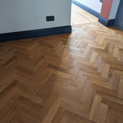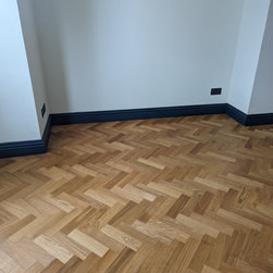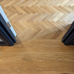 The herringbone parquet flooring brings a special elegance to the ground floor. We installed 15mm thick 70x280mm parquet blocks with a bevelled edge and finished with clear oil. The design was simple and borderless, allowing the full parquet pattern to be enjoyed from edge to edge. We ensured a seamless transition between the herringbone parquet and the adjacent boards by accommodating the different thicknesses and achieving an accurate subfloor level, managing a 5mm difference with precision.