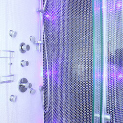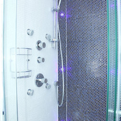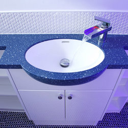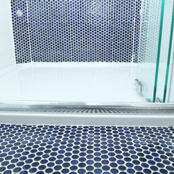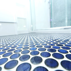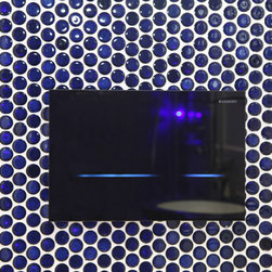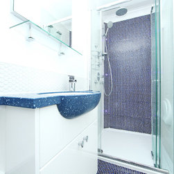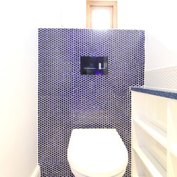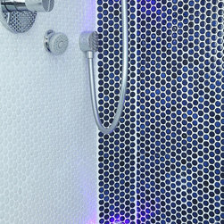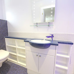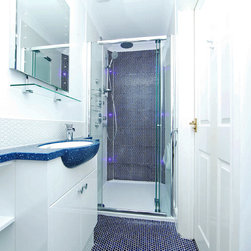 We filled the room with gadgets such as the Geberit touch-free flush plate and Hansgrohe Activated shower system which look in place on the ultra modern disk mosaic tiles. The fitted basin vanity unit boasts a sculptural waterfall tap and provides plenty of storage