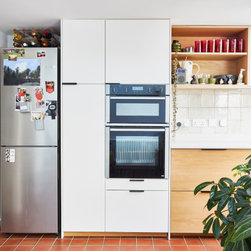 Our typical palette of materials and standard products are used throughout and are complemented with Plykea oak kitchen fronts & traditional red quarry tiles, which really ground the modern kitchen within the period Victorian property, and tie it in with the earlier glazed side extension.