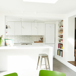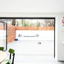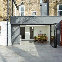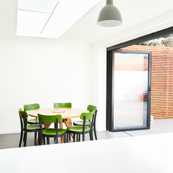 At the rear a full width extension was added, primarily as an extension to the relatively small kitchen occupying the rear projection. This extension provides direct access to the kitchen from the entrance hall, and also provides access into the newly formed snug. Large format bi-fold doors were provided to enable the space to be opened onto and connected with the newly paved garden - creating a large flexible social space.