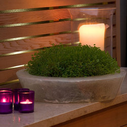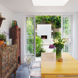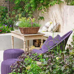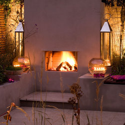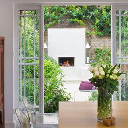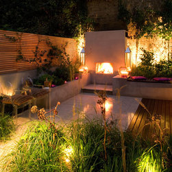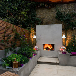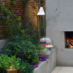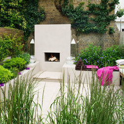 Charlotte Rowe Garden Design wanted to create a simple uncluttered space with good bone structure and strong bold lines - set off by soft lush planting. We also decided to make the space as usable as possible throughout the year by building an external fireplace and making sure the garden lighting was dramatic and atmospheric. The fireplace, which is set against the 4m high end wall of the garden, is the centrepiece. On either side are raised planting beds, seats and benches in block work and timber which have specially made cushions and mattresses for use in the summer. The paving is cream-coloured limestone, complemented by a narrow strip of Cedar decking. Two planting beds divide the space in two, creating an illusion of additional space. There are three pleached ornamental pear trees placed against the end wall behind the fireplace and espaliered fig trees against the South Western facing wall.