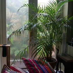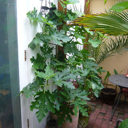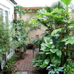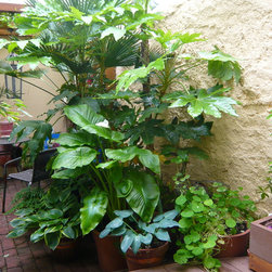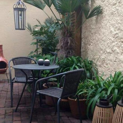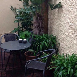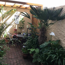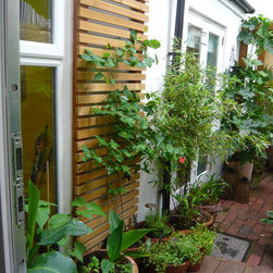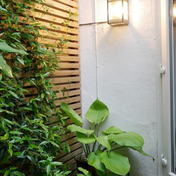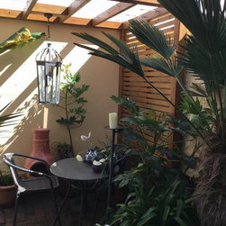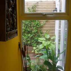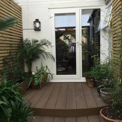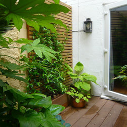 A small courtyard garden in a L shape, where Millboard decking was built in front of the living room. The existing brick was kept as part of the design. The walls were painted a soft yellow reminding us of the Mediterranean countries. A pergola was installed at the end and a large lantern was fixed in the middle. Slatted trellis around the area gives a contemporary feel to it. The planting were mainly in pots and very lush. We used Trachycarpus fortunei, Zantedeschias aethiopica and Agapanthus africanus among others