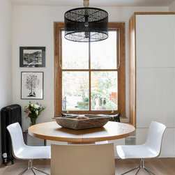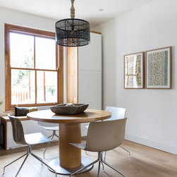 With this brief in mind, we replaced all the flooring with a warm Oak wood floor to bring a feeling of warmth into the rooms. The dining area was separated from the kitchen via an internal wall, and so the wall was removed for easier and direct access and a bespoke cabinet that doubles as a seating bench was installed for easy access to crockery during meal times.