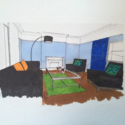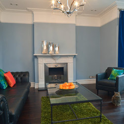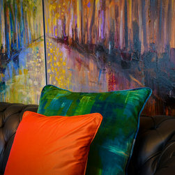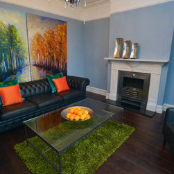 A private space away from the hurly burly of family life for our client in his family home...leather Chesterfield, industrial-look coffee table, dark wood floor, dramatic oil paintings...accented with vivid coloured cushions to tone with the artwork and strong, textured rug and curtains....a room for escape, for plotting, for feeling at peace and at home....