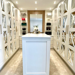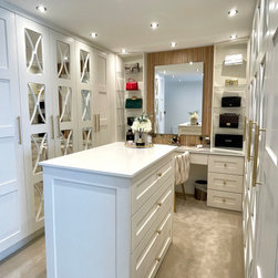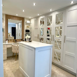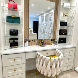 This walk in wardrobe was part of a bigger project. We refurbished the whole home to create a modern aesthetic to the clients home. The walk-in provides a beautiful space for the client to display her handbag collection while allowing plenty of storage