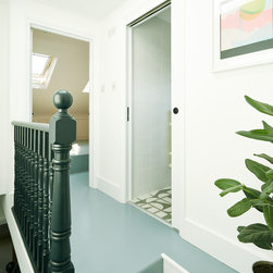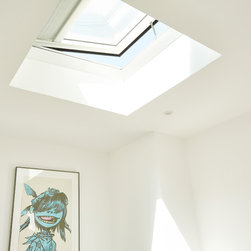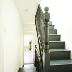 The new stair to the attic was relatively complicated due to the half landing level required to the rear projection dormer, and then an additional smaller run to the main dormer extension above. Whilst unconventional, the stair is comfortable and works well, and is a feature of the simple and pragmatic design approach that we use. A relatively large flat rooflight was then added above the landing to maximise natural light to the stair and landing below, and also allow natural ventilation to the stair.