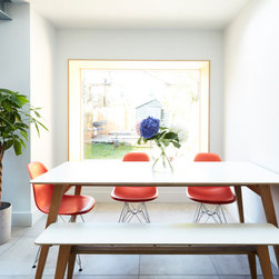 Within this footprint we added extensive roof glazing, to maximise natural light into the new spaces, and also the original rear reception, which has become an informal family room. A large format window seat was also created to add additional seating to the rear dining area, which also benefits from a large framed view of the garden.