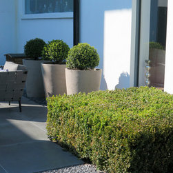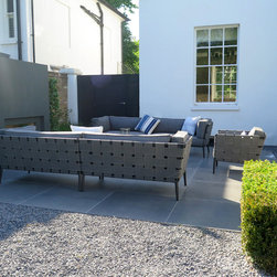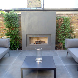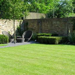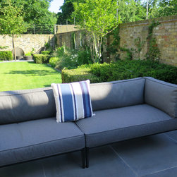 One of the main decisions was to use the side return for a cosy outdoor sitting area with a fireplace and really comfortable outdoor furniture. The rest of the garden would be mainly laid to lawn bordered and punctuated with low ‘tables’ of Buxus and Taxus hedging. As the garden house is not in line with the large sliding doors from the house, Charlotte Rowe Garden Design decided to create a generous side path down the garden with a large planting bed on one side and a small secondary sitting area. We built a very small platform-style terrace off the house and also a new threshold for the garden house, both paved in the same basalt as the main terrace, and in a small alcove close to the house is a gravel garden and classical sculpture which the owners wanted included.